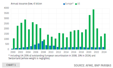 Securitisation issuance compared between Europe and the United States